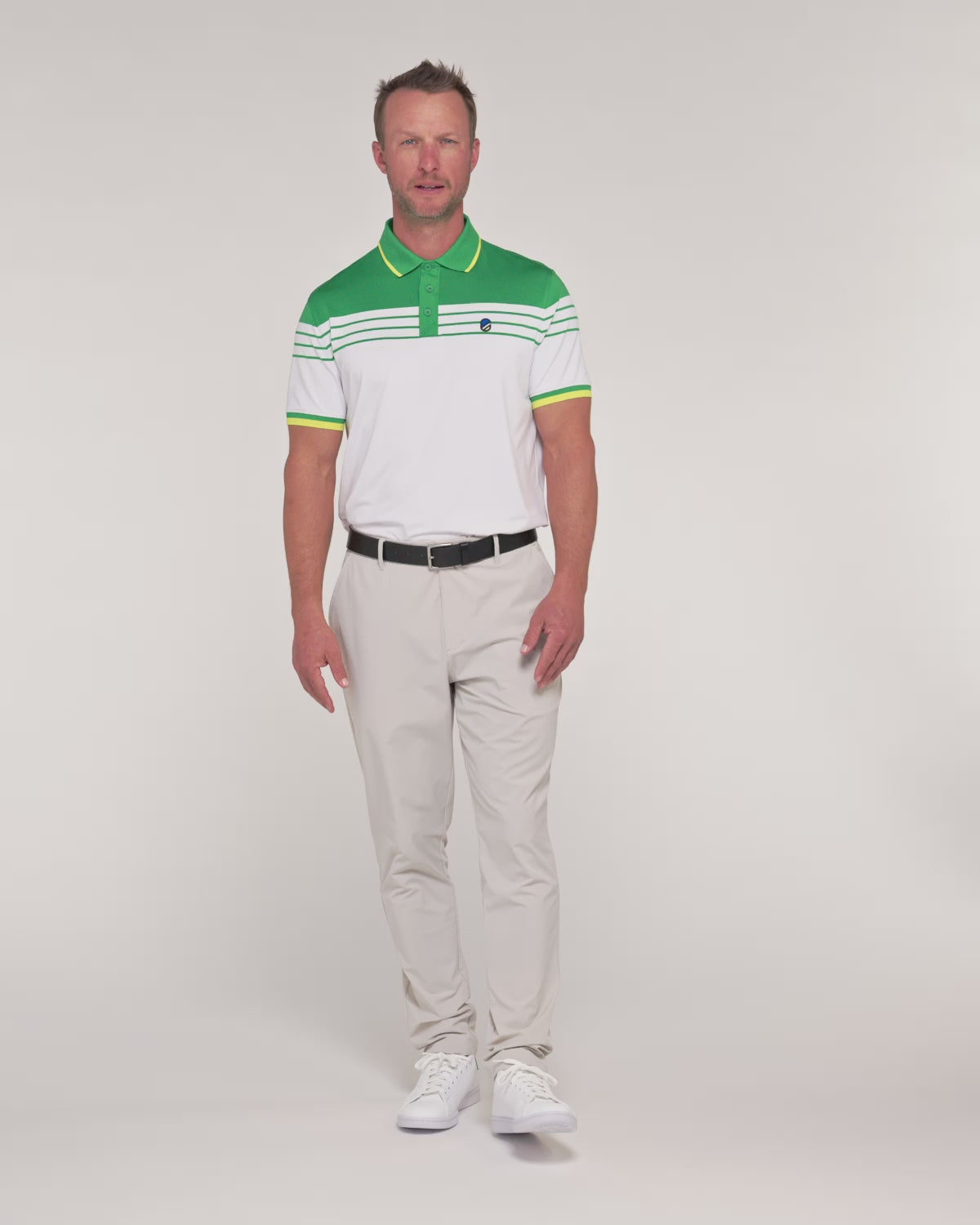 GREEN AND WHITE STRIPE- EXCR Performance ProKnit™: Our proprietary poly-blend fabric in the perfect golf weight, with 4-way "super stretch" for maximum comfort and range of motion